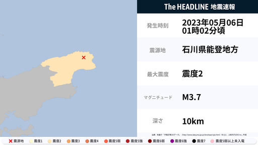5月6日1時2分頃、石川県で最大震度2の地震を観測