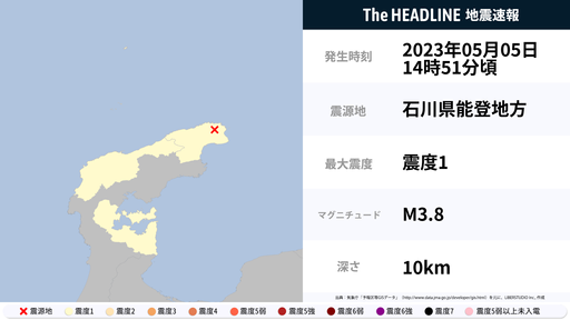 5月5日14時51分頃、石川県で最大震度1の地震を観測