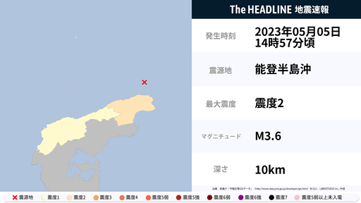 5月5日14時57分頃、石川県で最大震度2の地震を観測