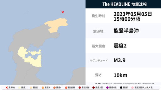 5月5日15時6分頃、石川県で最大震度2の地震を観測