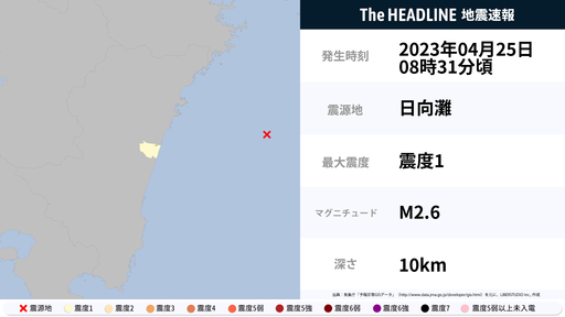 4月25日8時31分頃、宮崎県で最大震度1の地震を観測