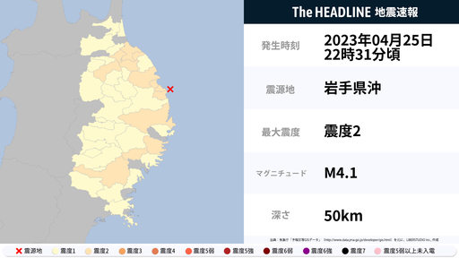 4月25日22時32分頃、青森県・岩手県で最大震度2の地震を観測