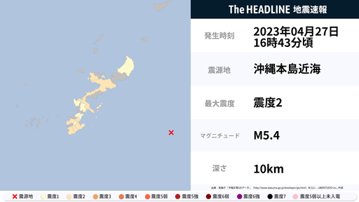4月27日16時43分頃、沖縄県で最大震度2の地震を観測