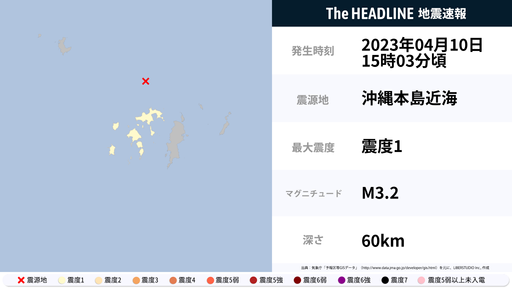 4月10日15時3分頃、沖縄県で最大震度1の地震を観測