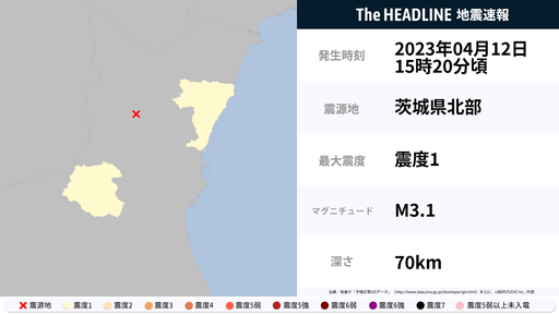 4月12日15時20分頃、茨城県で最大震度1の地震を観測
