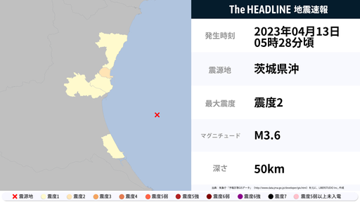 4月13日5時29分頃、茨城県で最大震度2の地震を観測