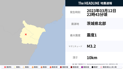 3月12日22時43分頃、茨城県で最大震度1の地震を観測