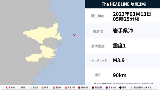 3月13日5時25分頃、岩手県で最大震度1の地震を観測