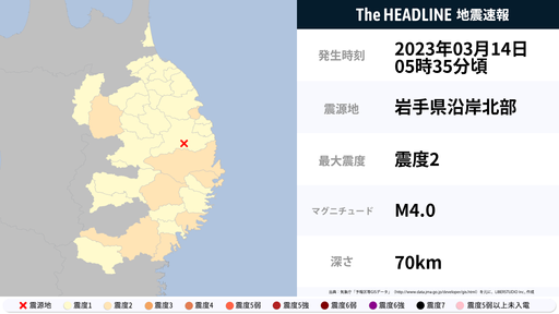 3月14日5時35分頃、岩手県・宮城県で最大震度2の地震を観測