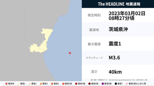 3月2日8時27分頃、茨城県で最大震度1の地震を観測