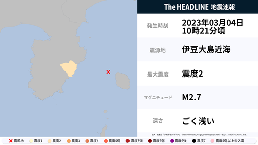 3月4日10時21分頃、静岡県で最大震度2の地震を観測