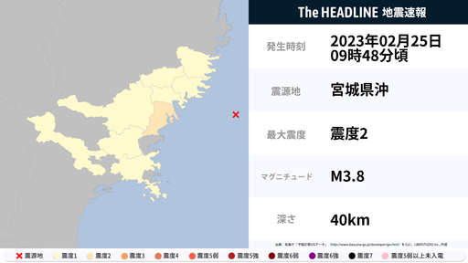 2月25日9時49分頃、宮城県で最大震度2の地震を観測