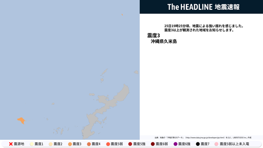 2月25日19時25分頃、沖縄県で震度3以上の地震を観測