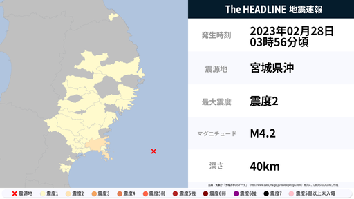 2月28日3時56分頃、宮城県で最大震度2の地震を観測