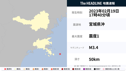 2月19日17時40分頃、岩手県・宮城県で最大震度1の地震を観測