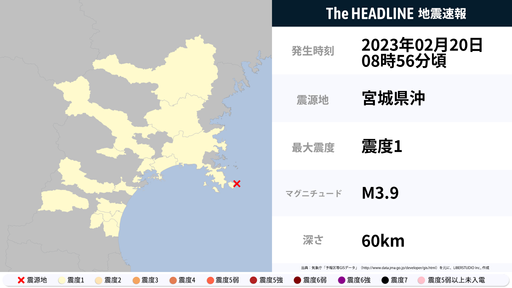 2月20日8時57分頃、岩手県・宮城県で最大震度1の地震を観測