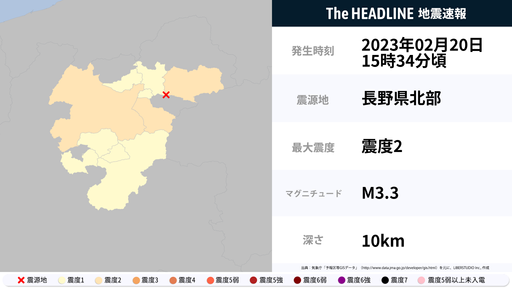 2月20日15時34分頃、長野県で最大震度2の地震を観測