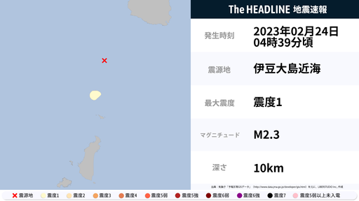 2月24日4時39分頃、東京都で最大震度1の地震を観測