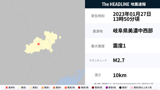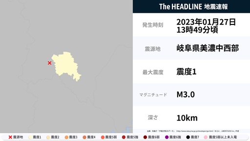 1月27日13時49分頃、岐阜県で最大震度1の地震を観測