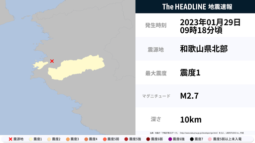 1月29日9時18分頃、和歌山県で最大震度1の地震を観測