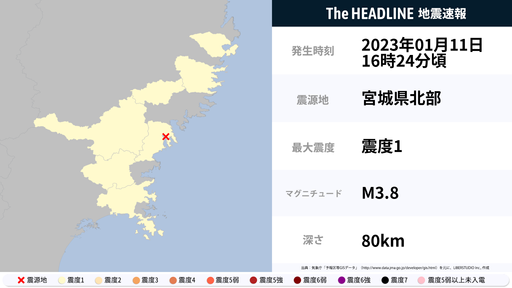 1月11日16時24分頃、岩手県・宮城県で最大震度1の地震を観測