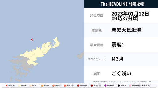 1月12日9時37分頃、鹿児島県で最大震度1の地震を観測
