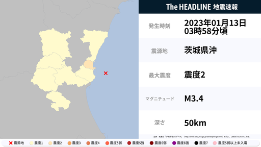 1月13日3時58分頃、茨城県で最大震度2の地震を観測