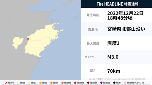 12月22日18時48分頃、大分県・宮崎県で最大震度1の地震を観測