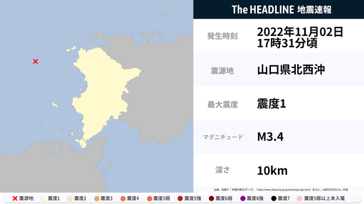 11月2日17時31分頃、山口県で最大震度1の地震を観測