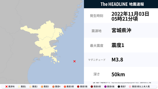 11月3日5時21分頃、岩手県・宮城県で最大震度1の地震を観測
