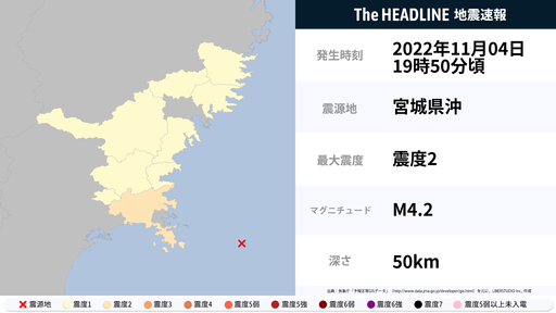 11月4日19時50分頃、宮城県で最大震度2の地震を観測