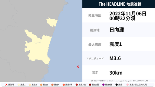 11月6日0時32分頃、宮崎県で最大震度1の地震を観測
