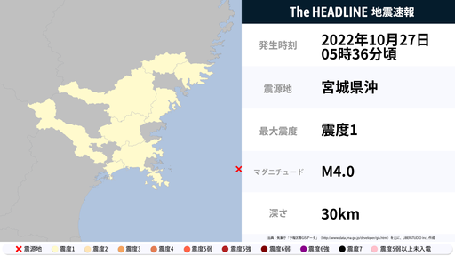 10月27日5時36分頃、岩手県・宮城県で最大震度1の地震を観測