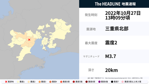 10月27日13時9分頃、三重県・滋賀県で最大震度2の地震を観測