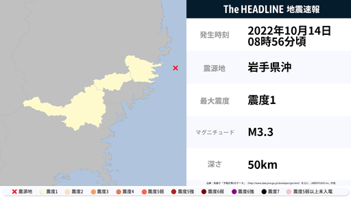 10月14日8時57分頃、岩手県で最大震度1の地震を観測