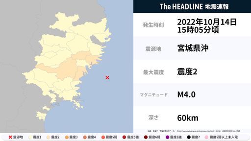 10月14日15時5分頃、岩手県・宮城県で最大震度2の地震を観測