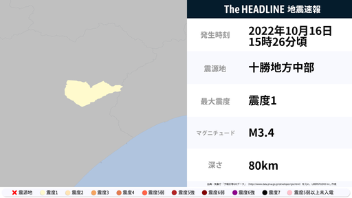 10月16日15時26分頃、北海道で最大震度1の地震を観測