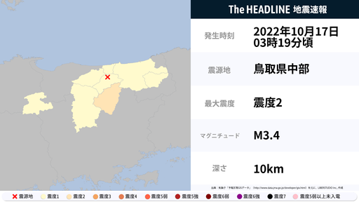 10月17日3時19分頃、岡山県で最大震度2の地震を観測