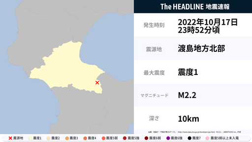 10月17日23時52分頃、北海道で最大震度1の地震を観測
