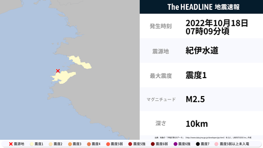 10月18日7時9分頃、和歌山県で最大震度1の地震を観測