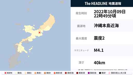 10月9日22時49分頃、沖縄県で最大震度2の地震を観測