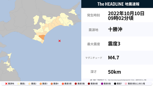 10月10日9時3分頃、北海道で最大震度3の地震を観測