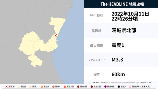 10月11日22時26分頃、茨城県で最大震度1の地震を観測