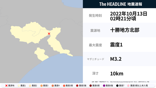 10月13日2時21分頃、北海道で最大震度1の地震を観測