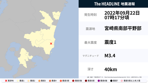 9月22日7時17分頃、宮崎県・鹿児島県で最大震度1の地震を観測