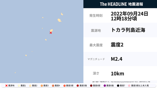 9月24日12時18分頃、鹿児島県で最大震度2の地震を観測