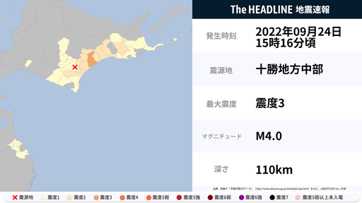 9月24日15時17分頃、北海道で最大震度3の地震を観測
