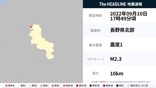 9月10日17時49分頃、長野県で最大震度1の地震を観測