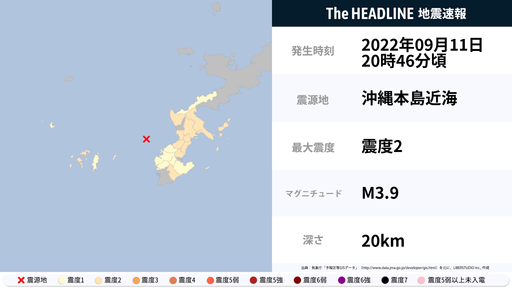 9月11日20時46分頃、沖縄県で最大震度2の地震を観測