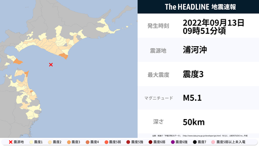 9月13日9時52分頃、北海道・青森県で最大震度3の地震を観測